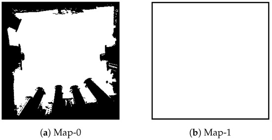 The experimental environments. The black and white grids represent the occupied and unoccupied grids, respectively. (a) A grid map built in a Lab environment. (b) A grid map without any obstacles.
