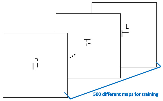 The training data are collected by 3000 set combinations, which are randomly selected. The distributions of each subgoal’s frequency and the order of the combinations are shown in Figure 7. There are 500 different training maps (see Figure 8) which are randomly generated obstacles in Map-1. The input dimension of the transformation learning stage is in every batch.