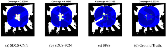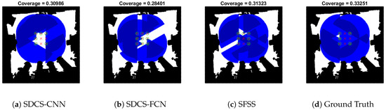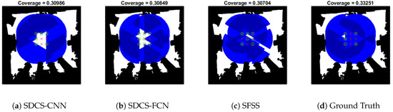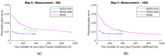 As Figure 12a shown, when the reconstruction error of three approaches is around 0.01, their greedy results are similar. The number of non-zero elements of SDCS-CNN is just 38, which is smaller than that of SDCS-FCN and SFSS. The coverage area in the Map-0 of each approach is shown in Figure 13. The greedy results of SDCS approach are similar to those of SFSS, while the k of SDCS is lower than that of SFSS (38 vs. 408).