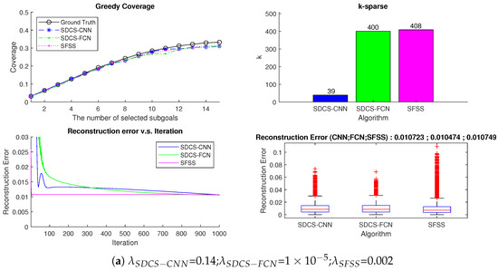 As Figure 12c shows, the performances of the three approaches with the smallest values in Section 5.2 were compared. SFSS has the lowest reconstruction mean error, but the k is the biggest (1014). Although the reconstruction error of SDCS-CNN is more than that of SFSS, the greedy results of three approaches are similar. This experiment demonstrates that SFSS can be replaced by SDCS-CNN (see Figure 15).
