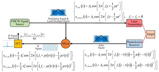Fixed-distance fuze is a device that measures the distance to the target by radio, laser, ultra-wideband, millimeter wave, and detonates the warhead at the best explosive point. Pulse laser fuze has been widely used for its characteristics of excellent anti-electromagnetic interference capability, simple structure, and low cost. However, pulse laser fuze is susceptible to interference from suspended particles such as smoke and clouds, which makes it difficult to extract and identify target signals [1,2]. Compared with pulse laser, the frequency modulated continuous wave (FMCW) laser ranging system depends on the beat frequency instead of the magnitude and time of the echo signal so that it has a natural advantage in target detection under dense fog conditions [3,4]. Therefore, it is very meaningful to improve the anti-interference ability of FMCW laser fuze in smoke environments.