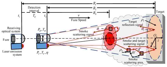 According to the transmission process of the laser in the smoke environment, three types of echo signal photons can be received by the fuze receiving system at a certain time, including: (1) photons that are directly transmitted to the target surface after being emitted, and are directly received by the fuse after being reflected by the target; (2) photons that do not reach the target surface scattered by the aerosol and return to the receiving syatem; (3) photons that reach the target surface scattered by the aerosol during transmission and eventually return to the receiving system. At this time, the power of the laser echo signal can be expressed as: