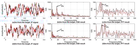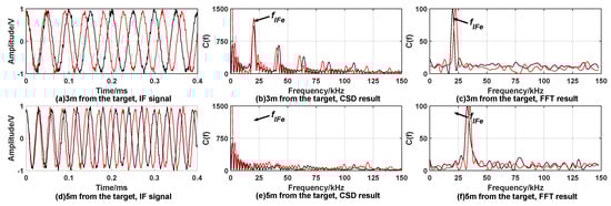 From the experimental results, it can be found that the smoke interference increases the noise in the IF signal, and the time domain waveform is obviously distorted. The noise in the spectrum increases, and a high-amplitude interference peak appears on the left of the target signal peak. The smoke interference signal may be used as the target signal to cause false alarm. Under smoke interference conditions, significant peaks can still appear at the reference frequency in the CSD algorithm processing results. The peak frequencies at 3 m and 9 m from the target are 19.6 kHz and 59.5 kHz, respectively. Table 2 shows that the theoretical frequencies corresponding to 3 m and 9 m are 20.01 kHz and 60.04 kHz. Based on the same error analysis in Section 5.1, the relative error between measured peak frequency and theoretical frequency does not exceed 5%, and the absolute error of distance calculated by Equation (24) does not exceed 0.15 m.