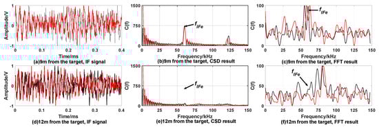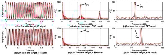 Simulation results when expected distance is 9 m without smoke interference. When fuze is 9 m away from the target, (a) is time domain waveform of IF signal; the processing result of CSD algorithm and FFT algorithm are (b,c), respectively. When fuze is 12 m away from the target, (d) is time domain waveform of IF signal; the processing result of CSD algorithm and FFT algorithm are (e,f), respectively.