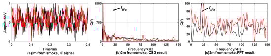 Simulation results when expected distance is 3 m with smoke interference but no target. When fuze is 3 m away from smoke, (a) is time domain waveform of the IF signal; (b) is the processing result of the CSD algorithm; (c) is the processing result of the FFT algorithm.