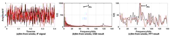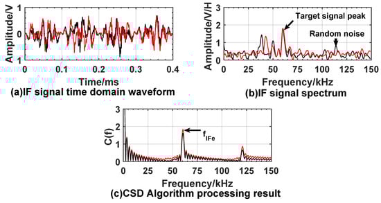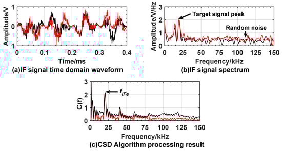 Experiment result when expected distance is 3 m under smoke interference. (a) is time domain waveform of IF signal; (b) is a spectrum of the IF signal; (c) is the processing result of the CSD algorithm. Each simulation result includes two detetions; the red curve represents the first detection, and the black curve represents the second detection.