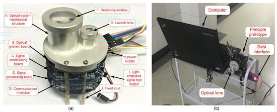 (a) shows the composition of FMCW laser fuze prototype; (b) the collected IF signal data are transmitted to the computer for processing.