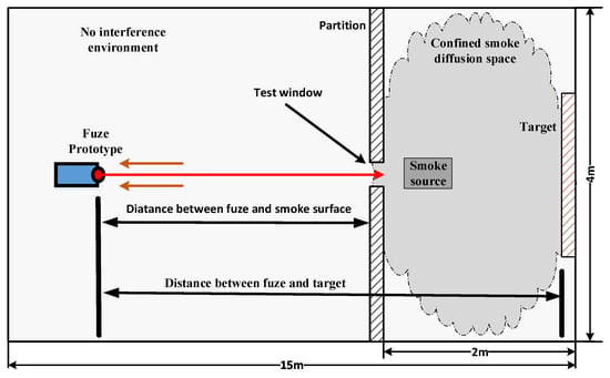 Schematic test scenario of fuze prototype under smoke interference. The smoke interference environment test was conducted in a closed room, and confined diffusion space was isolated by partitions.