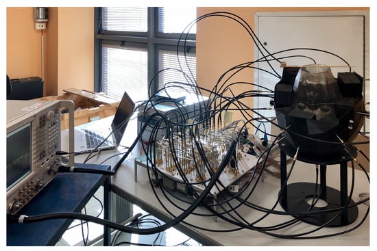 First, all the signals are generated and received by a standard VNA (Keysight N5227A, 10 MHz–67 GHz) where the input power is set to 0 dBm and the intermediate frequency (IF) filter to 10 Hz. The two ports of the VNA are connected, via flexible coaxial cables, to the two input ports of the switching matrix. The switching matrix has been realized with two single-pole-four-throw (SP4T), eight single-pole-six-throw (SP6T), and 24 single-pole-double-throw (SPDT) electro-mechanical coaxial switches. The internal connections between the switches are made with semi-rigid coaxial cables to maximize the isolation and minimize the insertion losses. Then, the 24 output ports of the switching matrix are connected, via flexible coaxial cables, to the 24 antennas placed on the helmet as supports hosting the 3D anthropomorphic head phantom. As detailed in [23], the switching matrix has been realized so that there are 24 paths from VNA port 1 to the corresponding 24 antennas, as well as 24 paths back to VNA port 2; all the paths were designed to have the same electrical length. In this way, each antenna can work as a transmitter (TX) or as a receiver (RX), and while one antenna is transmitting, the signals collected by the other 23 antennas are received in sequence by the VNA.