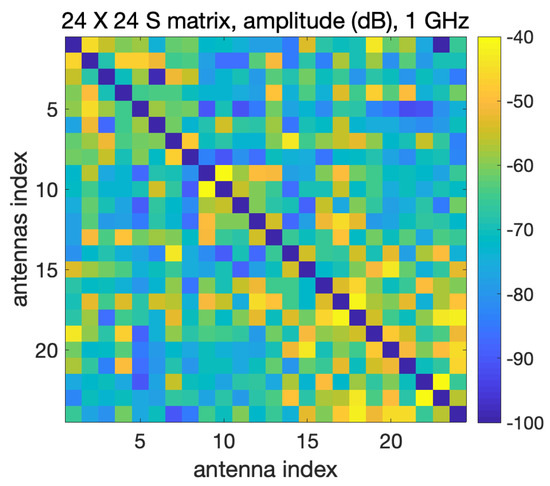 It can be noticed that the measured signals are above −100 dB; considering that the VNA noise floor is dBm (at 1 GHz and with an intermediate frequency (IF) filter equal to 10 Hz), with an input power of 0 dBm the measured data are then above the VNA noise floor [25]. Moreover, as expected, the matrix is approximately symmetric, which confirms the reciprocity of the realized system.
