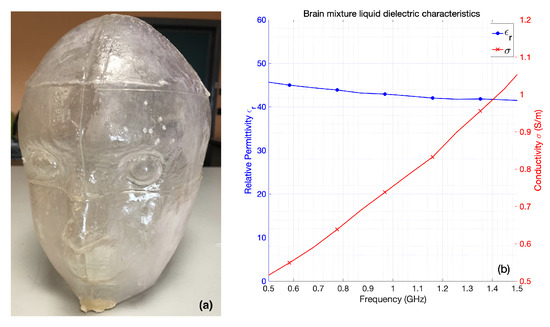 The phantom consisted of a cavity, shown in Figure 4a, whose wall thickness and height were equal to 3 mm and 26 cm, respectively. Its maximum cross section was approximately an ellipse whose minor and major axes were equal to 20 cm and 26 cm, respectively. The cavity was filled with a liquid mixture, made of Triton X-100, water and salt, which mimicked the average value of the dielectric characteristics of different brain tissues (white matter, gray matter) [27]. The measured dielectric characteristics of the mixture are reported in Figure 4b.