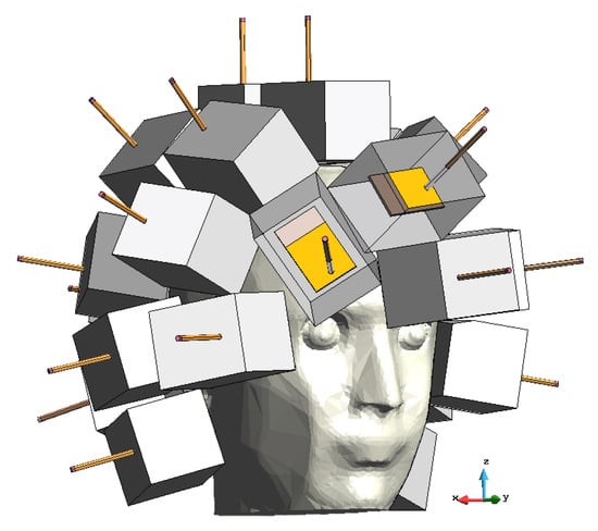 Each brick, placed on the head, represented one TX/RX antenna together with the dielectric coupling medium; the antenna ports were placed at the end of the coaxial cables leading out from the bricks. The dielectric characteristics of the bricks were the same as the nominal ones used in the realized system (see Section 2.2.2), i.e., and S/m. The head phantom was made of a dielectric medium representing the average brain tissues with and S/m, according to the properties of the medium adopted in the experimental validation (Section 2.2.3).