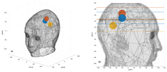 Three sphere locations (color dots) considered within the 3D head phantom: (a) 3D view; (b) 2D sagittal view.