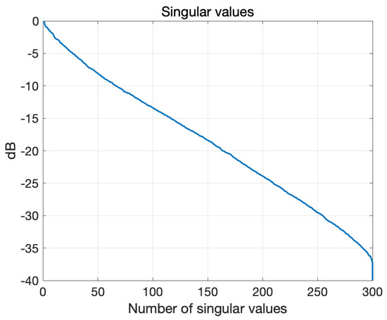 In the following, we describe the validation of the realized 3D microwave imaging system (Section 2.2), whose experimental set-up is detailed above in Section 2.2.5. First, by means of the digital twin, the outcomes of the experiments are foreseen and assessed. Then, the results of the actual experiments are reported. All the imaging results were obtained by using the TSVD algorithm described in Section 2.1. Figure 8 shows the singular values calculated for the relevant scattering operator, which were computed with the digital twin. The truncation index in (2) was set to dB for all the reported cases. To quantitatively assess the quality of the reconstruction images, the root mean square error (RMSE) was evaluated as