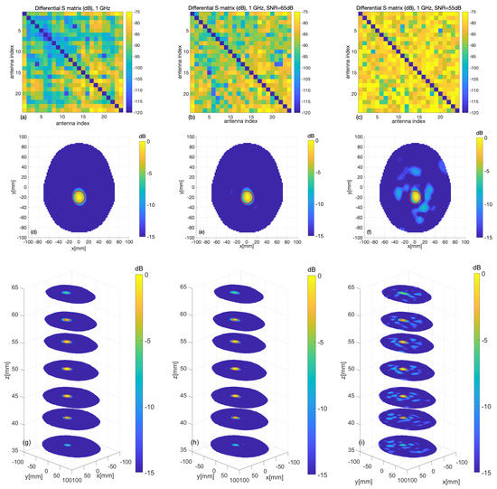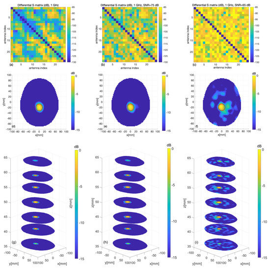 To confirm the validity of the above statement, the digital twin of the system described in Section 2.2.4 was exploited. To this end, the experiment for the target corresponding to the blue sphere in Figure 7 was simulated by including a 1.25 cm-radius plastic sphere with in the CAD head phantom. The simulation was repeated for the case of noiseless measurements (to provide an ideal benchmark) and for two SNR levels, namely 65 dB and 55 dB. Noise was modeled as an additive Gaussian white noise, which was added to the simulated data given by the S matrices computed with and without the target, respectively. Figure 9 shows the outcomes of the simulations. In particular, the first row shows the amplitude of the scattering matrices, where, in agreement with the actual experimental situation, the self-contributions have been omitted. It appears that the considered noise level severely affects the data matrix. The middle and bottom rows of Figure 9 show the normalized amplitude of the reconstructed differential contrast arising from the TSVD algorithm. It is worthwhile to note that the target is properly imaged, even when the SNR is comparable to or higher than the maximum values of the differential S matrix and the corresponding matrices appear very noisy (see Figure 9b,c), as the unavoidable occurrence of some artifacts does not restrict the interpretation of the result. The RMSE values obtained for the reconstructions at the three considered noise levels are , and , respectively.