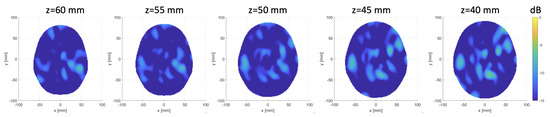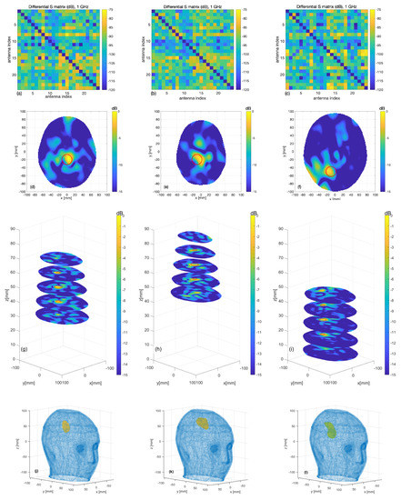 The differential scattering matrices obtained for the three cases are shown in Figure 11a–c. The second and third rows of Figure 11 display the images obtained for the different sphere locations indicated in Figure 7. The second row corresponds to the horizontal cross-section passing through the sphere center; the expected sphere location and size are highlighted with a red circle. The third row displays horizontal cross-sections at the different levels indicated in Figure 7b. In all cases, the targets are very well retrieved, and the images agree with the simulation results, which confirms our expectations. The RMSE values for these reconstructions are , and for the three considered positions of the target, respectively. Moreover, the last row of Figure 11 shows the 3D rendering of the imaged stroke obtained by plotting the values of the normalized differential contrast amplitude, which are above −3 dB. Finally, Figure 12 reports horizontal cross-sections at various levels of the 3D reconstructed image obtained by differentiating two different sets of measurements of the same scenario; all the images are normalized with respect to the maximum value of Figure 11b, which represents a case when the target is present.