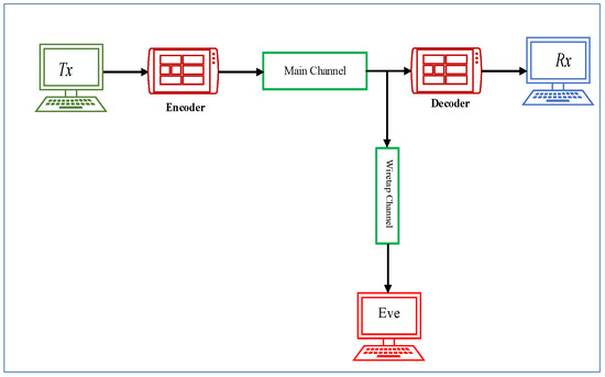 Considering the wiretap channel, the transmitting channel’s message is represented as and is encoded and broadcasted as a codeword . The receiver and eavesdropper (Eve) receive and , respectively. Eve’s received information via her receiving signal is then modeled and described as in Equation (1),