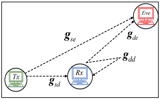 In the set-up, all three nodes are attached to a single transmitting antenna. The intention of the transmitter (Source) is to broadcast some private information to the receiver (Destination) while Eve (a passive eavesdropper) attempts to gain access to the sensitive private information. We assume that each link channel entails several M orthogonal subcarriers and each subcarrier fading is flat. Tackling eavesdropping attacks in this set-up entails that artificial noise is broadcasted by with the same frequency and in the same channel, which reduces Eve’s reception quality. Considering that this jamming attack operates at the same frequency and time in which information is transmitted from to ; thus, it is assumed that has full-duplex aptitude. It is well known that there is no perfect full-duplex system, therefore always manifests some level of residual self-interference.