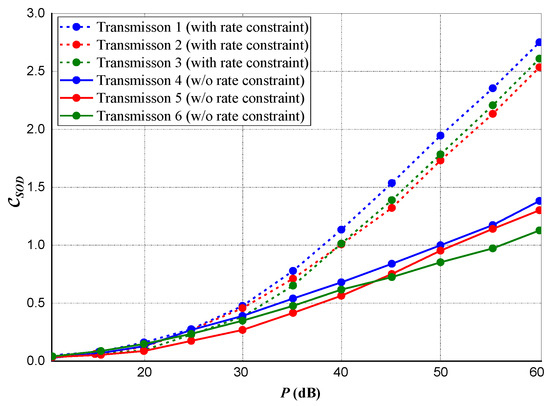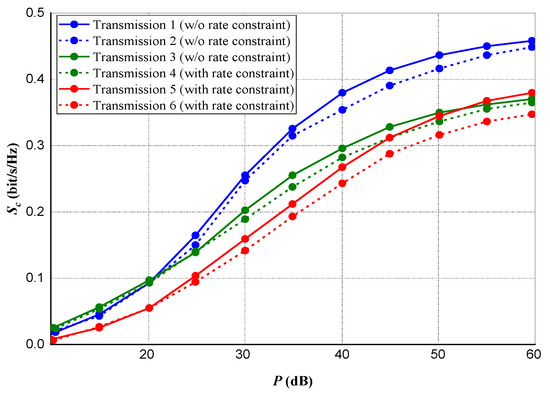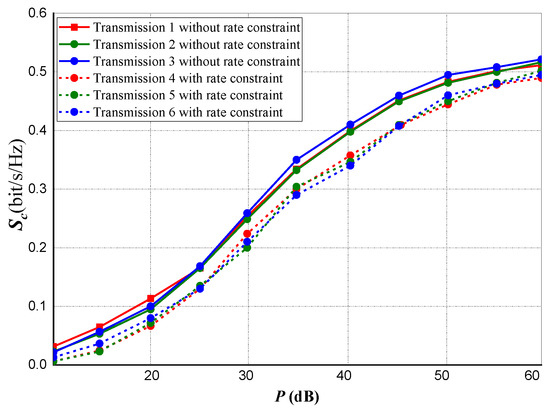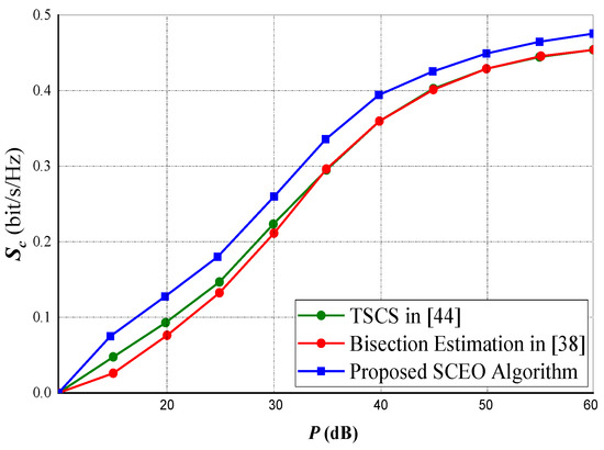 In Figure 9 and Figure 10, we compared our proposed sequential convex estimation optimization (SCEO), which is intended to mitigate the optimization problem in (15) against the Bisection method in [38] and the two-stage cooperative jamming scheme (TSCS) in [44]. A total of 60 transmitting antennas were selected for both experiments. For the rate constraints, about of optimal attainable capacity (OAA) was selected for Figure 9, whereas for Figure 10, the power constraint is set at 20 dB.