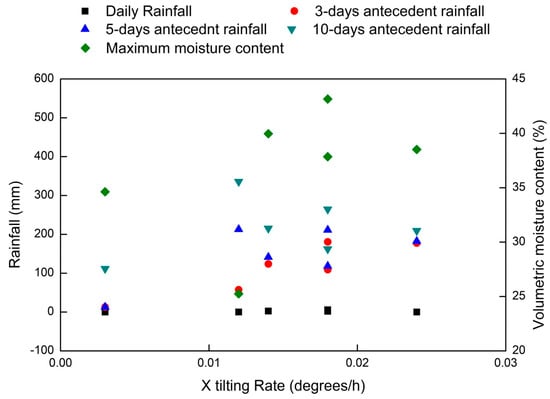 | Season | Daily Rainfall (mm) | 3-Day Antecedent (mm) | 5-Day Antecedent (mm) | 10-Day Antecedent (mm) | Maximum Moisture Content (%) | X Tilting Rate (°/h) | Y Tilting Rate (°/h) |