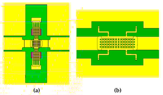The Ka band device is almost twice smaller in size, so the same switch geometry cannot be fitted in it due to its dimensions and space needed for integration. One of the most compact configurations is related to cantilever-type geometry (i.e., single-hinged membrane) [18]. However, from a general point of view, cantilevered MEMS switches are not as robust as clamped-clamped designs [19,20]. To avoid reliability issues, a compact longitudinal membrane with complex anchor geometry has been designed, as reported in Figure 2b. This membrane with optimized characteristics allows lowering the actuation voltage and reducing the area occupation, while still relying on double-hinged MEMS suspended membrane solution, as for the transverse micro-switch.
