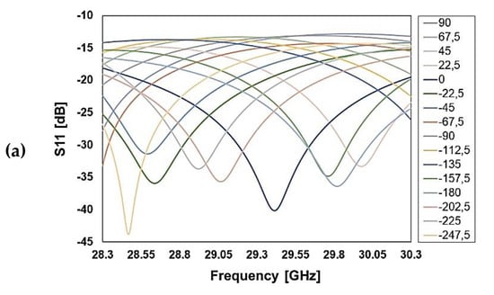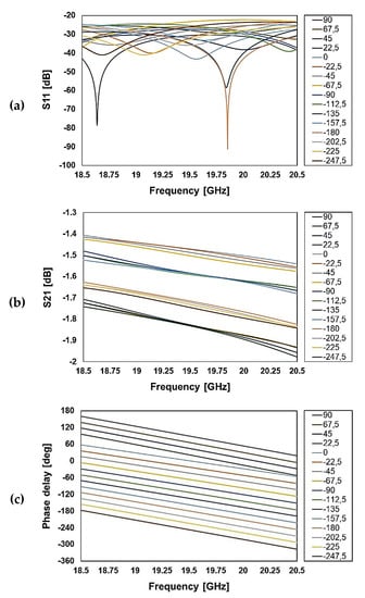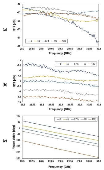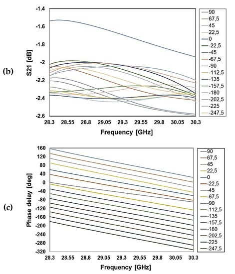 On the other hand, the device working at 29.3 GHz has simulated losses better than −2.4 dB for most configurations, despite at −90 and +90 phase shifts, −2.6 dB losses are observed at the maximum limit of 2 GHz frequency range (Ka band phase shifter; see Figure 5).