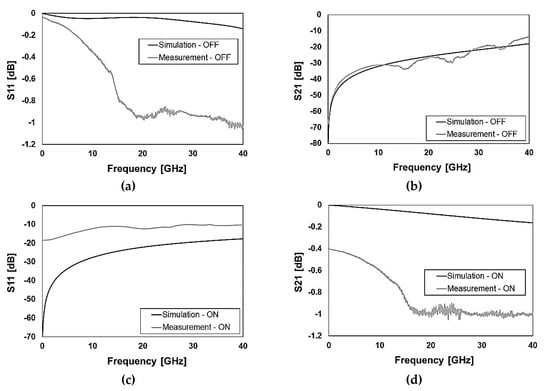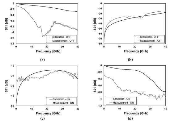 Measured versus simulated S-parameters characteristics of the longitudinal ohmic switch reported in Figure 2b and Figure 3b with reference to (a) reflection (S11) in the OFF state; (b) isolation (S21) in the OFF state; (c) reflection (S11) in the ON state; (d) transmission (S21) in the ON state.