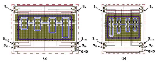 The reference phase pads are labeled as S0 and placed at the top of the scheme. The pads named S22.5, S45, S90, and S180 route the DC signal to the branches realizing the corresponding phase delays. The K and Ka bands RF-MEMS phase shifters have a silicon chip footprint of 10.5 mm × 7.5 mm and 7.5 mm × 8.5 mm, respectively.