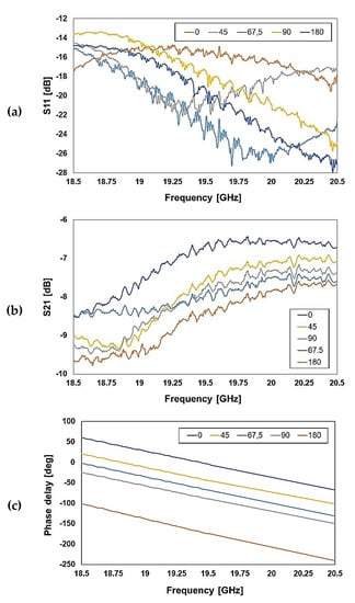 For the Ka band network, the measured S11 ranges between −13 and −17 dB at the center frequency (see Figure 11a), while the simulated values are comprised between −14 dB and −35 dB (see Figure 5a). The measured transmission is between −7 and −9.5 dB at the center frequency (see Figure 11b), while the simulations show an S21 between −1.7 and −2.4 dB (see Figure 5b). On the other hand, as for the previous network, the measured phase delay is more accurate.