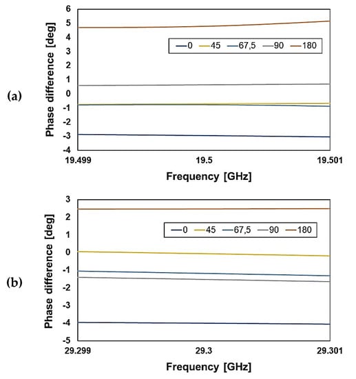 In conclusion, despite the large divergence between experimental and nominal characteristics, the measured phase delay configuration exhibits a satisfactory match with the simulations, as highlighted by the phase difference plots reported in Figure 12, for a very narrow range around the K and Ka band center frequencies (Figure 12a,b, respectively).