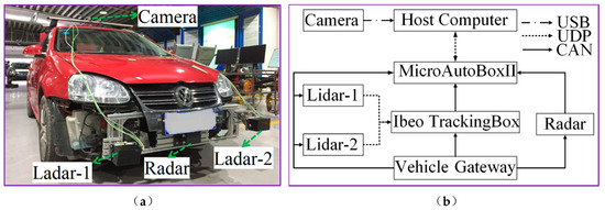 We use the light detection and ranging (lidar) produced by Ibeo to detect the motion state information of the target vehicle and take it as the ground truth, which is used to verify the performance of the target tracking algorithm of the millimeter-wave radar. In order to make the sensors smarter, Ibeo will provide point cloud processing algorithm software for the lidar. At present, the algorithm provided by Ibeo supports target recognition and tracking. The motion state information of the target vehicle includes longitudinal distance and longitudinal speed. As shown in Figure 4a, the ego-vehicle is equipped with two lidars, which are lidar-1 and lidar-2. The Ibeo TrackingBox produced by Ibeo is responsible for data fusion of the two lidars. Table 2 shows the specific technical specifications of the four scan levels lidar provided by Ibeo.