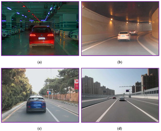 Experimental environment. (a) underground parking, (b) tunnel, (c) campus, (d) expressways.