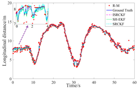 The measurement data of the target vehicle are indicated by the red circle, without the ISRCKF algorithm optimization and containing noise (R-M). The solid blue line represents the ground truth of the motion state of the target-vehicle measured by lidar. The measurement data of the target vehicle are indicated by the magenta dashed line, with the ISRCKF algorithm optimization. The measurement data of the target vehicle are indicated by the green solid line, with the SH-EKF algorithm optimization. The measurement data of the target vehicle are indicated by the cyan dot-dash line, with the SRCKF algorithm optimization.