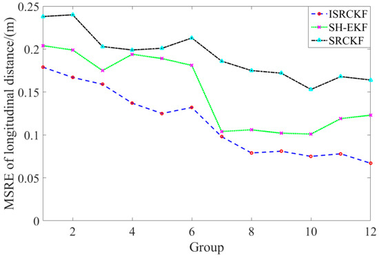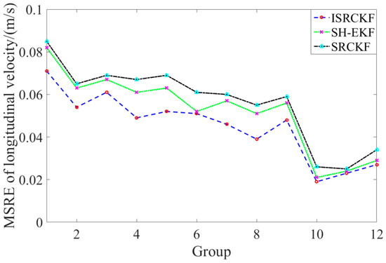Figure 5 and Figure 6 show the time history curves of the longitudinal distance and longitudinal velocity of the target-vehicle relative to the ego-vehicle. It can be concluded from the figures that the data fluctuation of the ISRCKF algorithm during tracking the target is small, and the target tracking performance of the ISRCKF algorithm is significantly better than the SH-EKF and SRCKF algorithms. Through references [27,28,29], it is found that the root mean square error (RMSE) can be used to quantitatively analyze the filtering accuracy. In order to quantitatively analyze the filtering accuracy of the ISRCKF, SH-EKF, and SRCKF algorithms, we counted the RMSE of the 12 groups of experiments. and the results are shown in Figure 7 and Figure 8. The test environment of the statistical value for RMSE of groups 1, 2, and 3 is the underground parking. The test environment of the statistical value for RMSE of groups 4, 5, and 6 is the tunnel. The test environment of the statistical value for RMSE of groups 7, 8, and 9 is the campus. The test environment for the statistical value for RMSE of groups 10, 11, and 12 is the expressway.