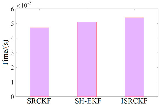 From Figure 9, it can be concluded that the target tracking algorithm proposed herein takes 0.0053 s on average, slightly up that of SH-EKF and SRCKF. SH-EKF and SRCKF take 0.0051 s and 0.0047 s on average, respectively.
