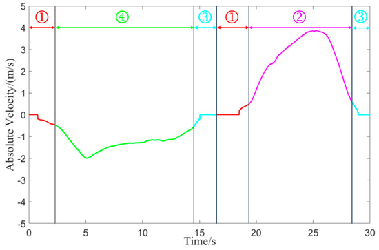 Figure 10 is the time history curve of the target-vehicle’s absolute velocity. The meanings of ①, ②, ③, and ④ in Figure 10 represent the stationary, moving, start-stop, oncoming movement states in Figure 2, respectively. We have used the same colors to indicate the same motion state in Figure 10 and Figure 2.