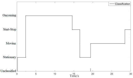 In the two sports periods of and , the classification method proposed classifies target vehicles as start-stop targets. The classification method shows that it has a certain memory effect on the motion state of the target vehicle. The test results show that the classification and recognition results are consistent with the motion state of the target vehicle.