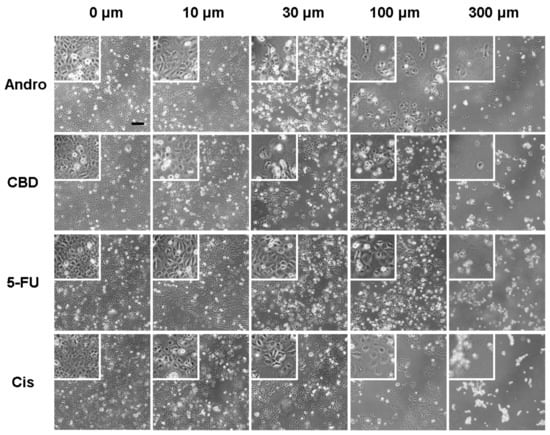Figure 1. Typical phase-contrast images of SCC-25 cells cultured in 24-well cell culture plates 24 h after exposure to different concentrations (0, 10, 30, 100, and 300 µM) of anticancer compounds, andrographolide (Andro), CBD, 5-FU, and cisplatin (Cis). Five independent experiments were performed (n = 5). Cell number decreases as the compound concentration increases. Cells exhibit perceptibly distressed and shrunken morphology 24 h after exposure to 100 µM or 300 µM of any of the four anticancer compounds. Scale bar = 200 µm.