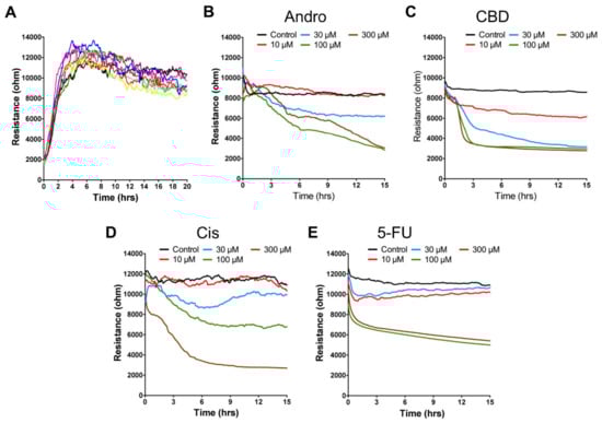 Figure 2. (A) Resistance time series of SCC-25 cell attachment and spreading. Each colored curve represents the time course obtained from each of the eight electrode-containing wells. Typical resistance time course of confluent SCC-25 cell layers upon addition of various concentrations of (B) andrographolide, (C) CBD, (D) 5-FU, and (E) cisplatin. Three independent ECIS experiments were performed (n = 3). In each experiment, three wells were measured for each drug concentration. At time 0, each anticancer compound dissolved in DMSO was added to give the final concentrations of 10 μM (red), 30 μM (blue), 100 μM (green), 300 μM (brown), and control (black), and the resulting changes in resistance were followed. Data were collected for 15 h after adding for each compound.