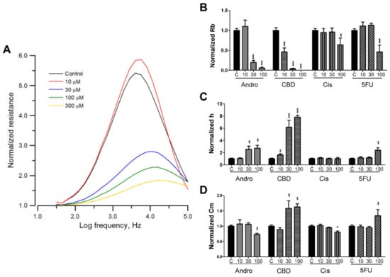 To further understand the cytotoxic effects of andrographolide, CBD, 5-FU, and cisplatin on morphological changes of SCC-25 cells—especially on cell–cell and cell–substrate contacts—frequency-scan measurements were taken from cell-covered electrodes 24 h after exposure to different concentrations of each compound. Normalized resistance as a function of frequency was calculated by dividing the cell-covered resistance measured at various frequencies with the corresponding cell-free value (Figure 3A). For the normalized resistance spectrum of the control cells (black lines in Figure 3A), the ratio value started from about 1.1 at 31.5 Hz, increased with increasing frequency to the peak value, approximately 5.5 at 4 kHz, and then decreased with increasing frequency until about 1.8 at 100 kHz. This biphasic feature of the normalized resistance spectrum indicates that impedance measurement at 4 kHz can sensitively reflect the morphological changes of SCC-25 cells. After fitting the frequency-scan data with the cell-electrode model calculation, the junctional resistance between cells (Rb), average cell–substrate separation (h), and membrane capacitance (Cm) of the control SCC-25 cells were 1.8 Ω·cm2, 34 nm, and 2.5 μF/cm2, respectively. These are typical parameter values for many endothelial or epithelial cell lines.