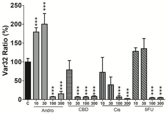 Figure 4. Var32 analysis of SCC-25 cell micromotion 24 h after exposure to different concentrations of each compound. Values shown are mean ± standard error (n = 4 for each concentration). * p < 0.05, ** p < 0.01, *** p < 0.001. Each value is expressed as a percentage of control.