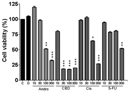 Figure 5. Change of cell viability of SCC-25 cells upon treatments of andrographolide, CBD, cisplatin and 5-FU for 24 h at the indicated concentrations. In each experiment there was a control (C) and cells treated with DMSO (D). Cell viability was evaluated by alamarBlue assay. All treatments at higher concentrations displayed statistically significant reductions relative to the control groups. Five independent experiments were performed (n = 5) and results are shown as mean ± SEM. * p < 0.05, ** p < 0.01, *** p < 0.001.