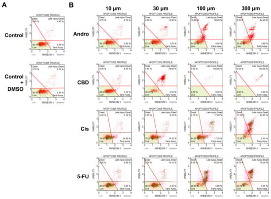 Figure 6. Apoptosis analyzed by flow cytometry following Annexin V/7-AAD binding assays. (A) Two negative control groups were used: cells without drug treatment and cells treated with DMSO. (B) SCC-25 cells were treated for 24 h at four different concentrations of andrographolide, CBD, cisplatin, and 5-FU.