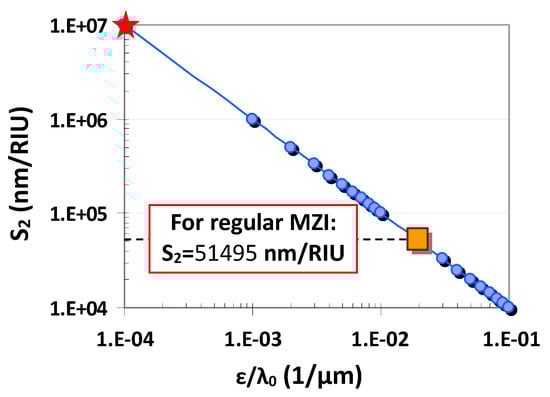 Figure 2 shows the calculated device sensitivity S2 as the value ε/λ0 varies. Theoretically speaking, one can realize an arbitrarily high sensitivity when making the value ε approach zero, which can be realized easily by choosing the MZI arm lengths according to Equations (7) and (8). For example, one has S2 = 107 nm/RIU when ε/λ0 = 0.0001 μm−1. As a comparison, we also calculate the devices sensitivities for a regular MZI sensor with two equally long arms (i.e., l1 = l2), which is about 51,495 nm/RIU (see Figure 2). One can see that the present asymmetric MZI sensor enables much higher device sensitivity than a regular MZI sensor with l1 = l2.