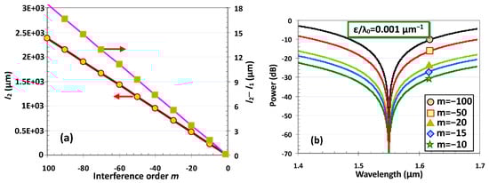 Here, we give an example of designing an MZI sensor for a desired ultrahigh sensitivity (e.g., S2 = 106 nm/RIU and ε/λ0 = 0.001 μm−1). One can obtain a solution for the lengths (l1 and l2) of the MZI arms by using Equations (7) and (8) for any given interference order m. For the case of ε/λ0 = 0.001μm−1 considered here, one has N2(D1+ε/λ0)−N1D2 < 0, and consequently, the interference order m should be an negative integer, so that the solutions for the lengths are positive, i.e., l1 > 0 and l2 > 0.