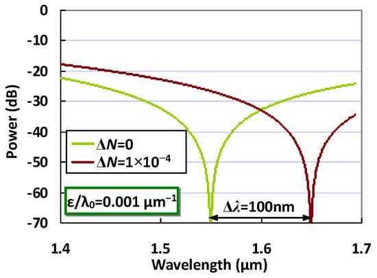 The calculated spectral responses of an MZI sensor when choosing ε/λ0 = 0.001 μm−1.