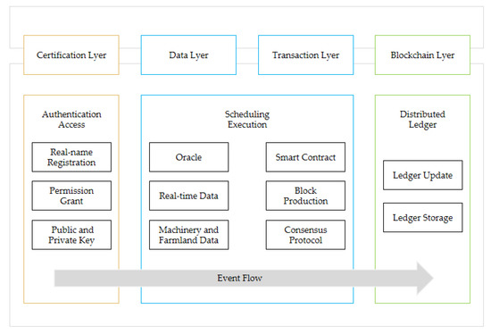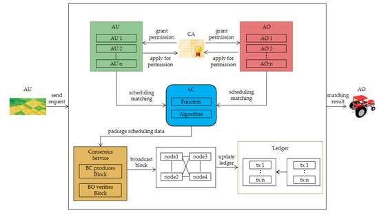 It is a fact that the agriculture machinery will consume a great number of fossil fuels and induce much environment pollution and soil degradation. As an important means for digital farming the newly-emerging IT technologies take a great role to improve agriculture production efficiency, including blockchain, big data, artificial intelligence and so on. Unlike centralized systems, blockchain technology is decentralized and distributed. Nakamoto first proposed the blockchain concept in 2008 [4]. This technology eliminates the dependence on the third party, makes the transmission and transaction costs extremely low, and improves the transparency of the process [5,6]. Moreover, the knowledge and technology of cryptography guarantee the non-tampering and security of the blockchain [7,8]. In contemporary society, the blockchain technology has been applied in many fields, including supply chain, education, financial industry, etc. [9]. Comparing with the problems of the traditional scheduling method, the advantages of blockchain are as follows: