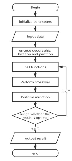 The procedure of Algorithm 1 is based on the genetic algorithm. After initializing parameters and generating first population, the required data is inputted. Then, SC will call functions mentioned in Section 4.1 and mentioned later in this chapter. After that, crossover and mutation will be performed with probability of crossover (Pc) and probability of mutation (Pm), respectively. The next step is to compare the fitness value t after each iteration. If the fitness function of any individual produced by evolution exceeds T, the result will be outputted, and the algorithm will end. Figure 4 shows the flowchart represented by the pseudocode.
