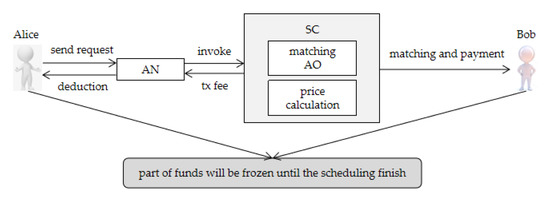 The transaction payment process of this system is based on digital currency, which eliminates the red tape of transferring money between regional banks, and the extra transaction fees charged by the bank. Although this system does not have the Coinbase transaction that Bitcoin and Ethereum do, it uses existing and legal digital currency. The payment processes are shown in Figure 7. First, Alice (AU) sends a transaction request. After acceptation of the transaction, some of Alice’s funds would be temporarily frozen, in order to prevent Alice from sending attack information, such as denial of service attack (DoS). Then, the AN invokes the SC to match the most optimal result—Bob (AO), and then enters the transaction processing phase. Before this phase, some of Bob’s funds would be also frozen to prevent dishonest and other malicious behaviors in the scheduling process. Their funds would be released after the deal closes. Assuming that Bob acted maliciously in the scheduling process, while the remaining participants were honest, Bob’s frozen funds would be deducted, and allocated to Alice and AN. If the scheduling is normal, AN will invoke the SC that calculates the fees that Alice needs to pay and that Bob should charge. Finally, the payment process is complete. In addition, if AN successfully generates the block, some transaction fees can be obtained, which are determined by the number of transactions contained in the block.