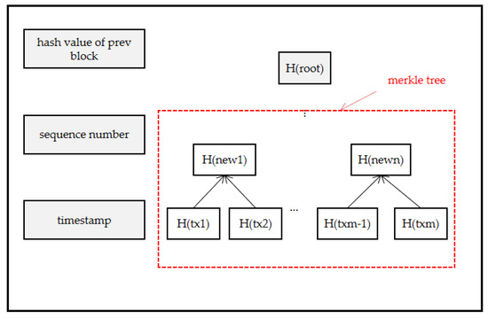 Moreover, each block consists of a sequence number, a timestamp, the hash value of the previous block, and the hash value of the root of the Merkle Tree composed of many transactions, as shown in Figure 10. The expression is: